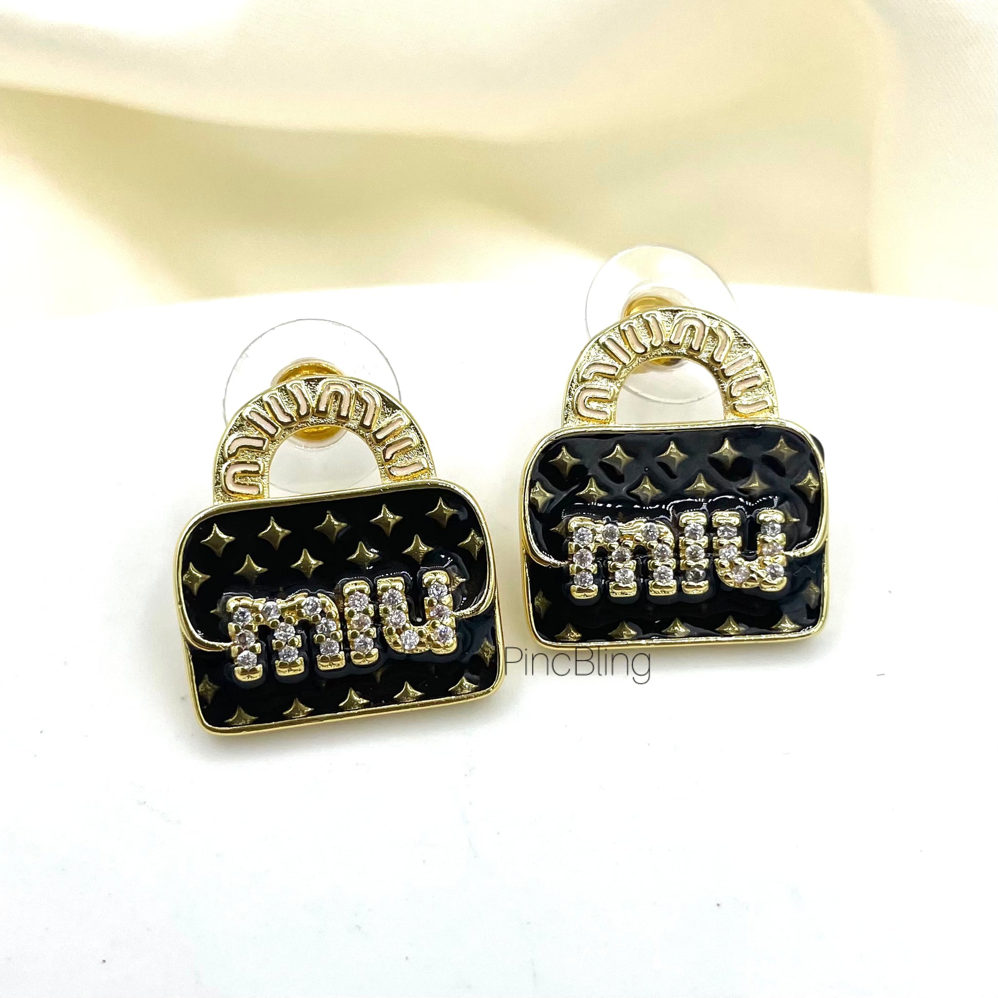 Small round black studs with gold detail