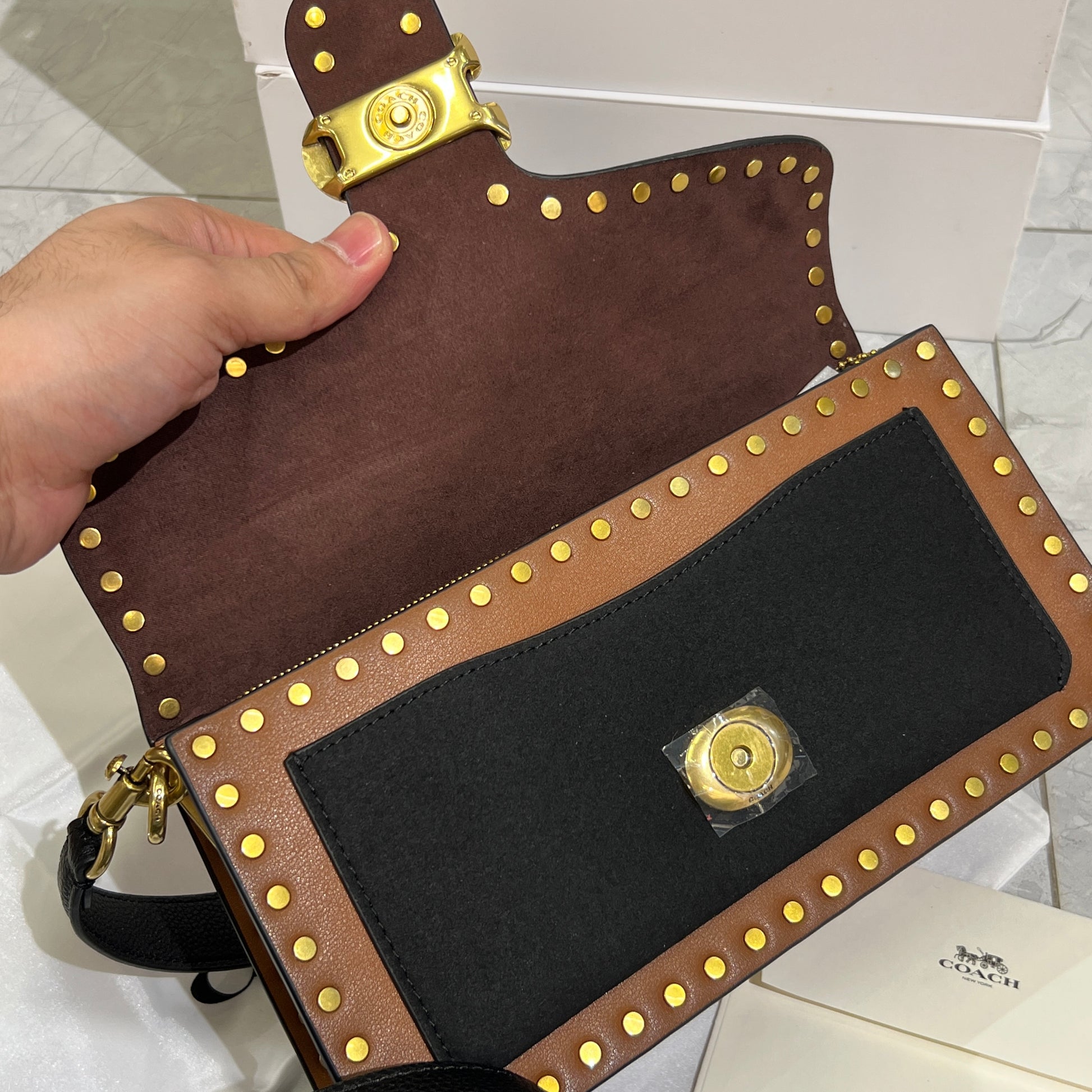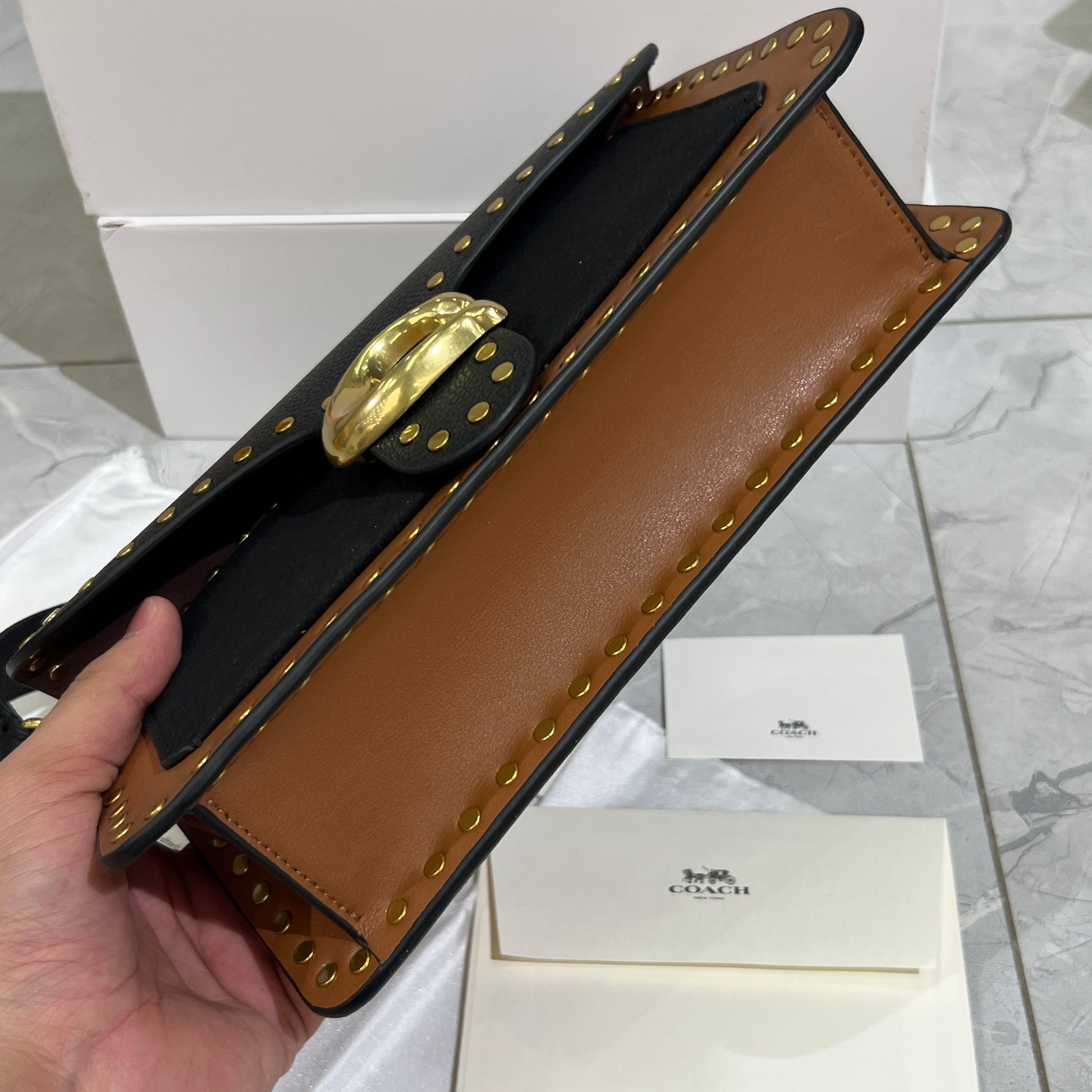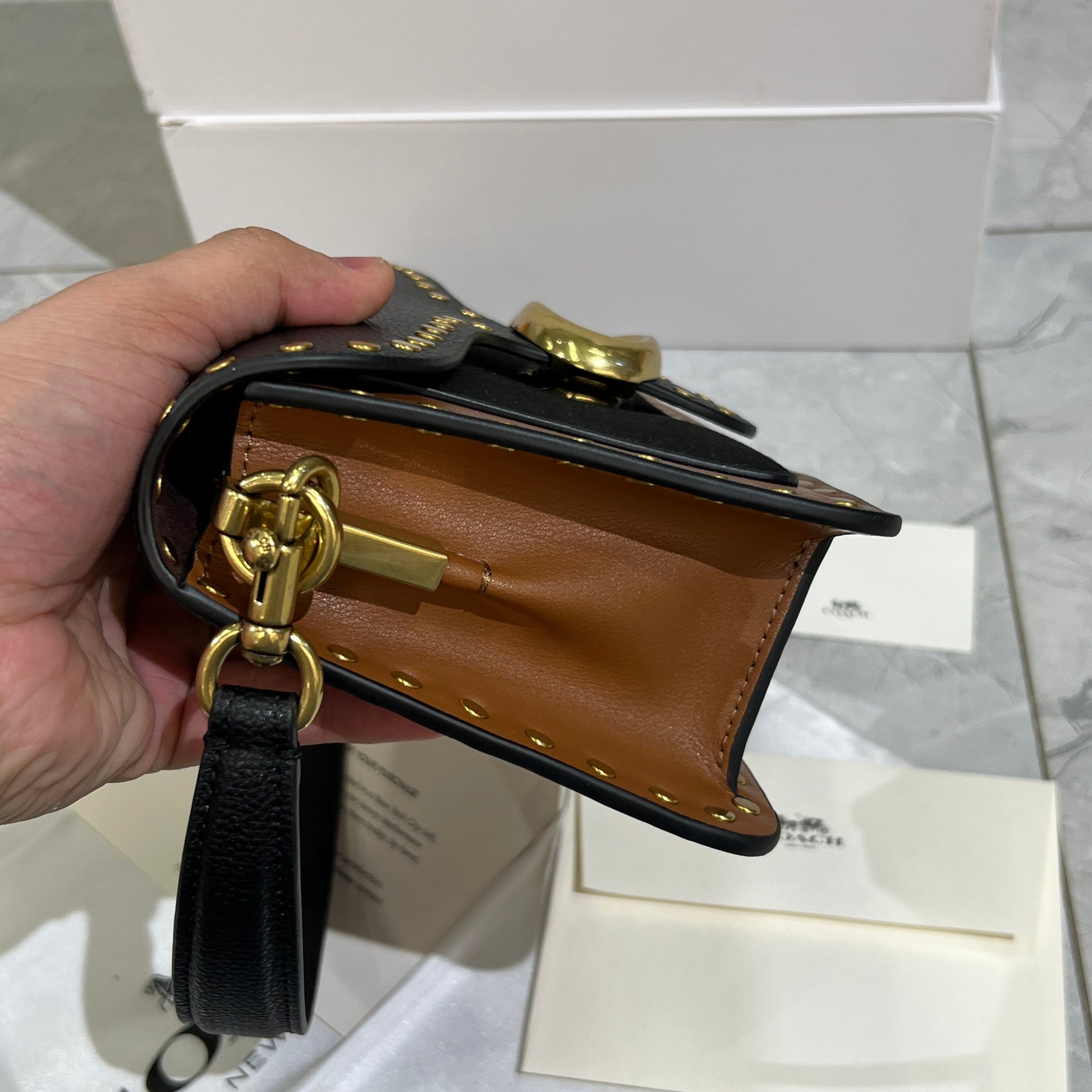 Compact caramel toned bag with studded trim for a bold yet classy vibe.