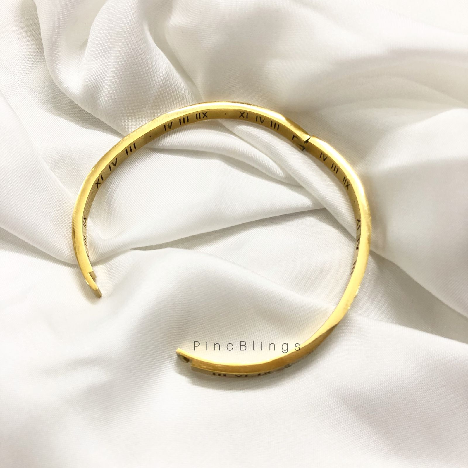 Round gold bracelet engraved with subtle lettering for a luxe touch.