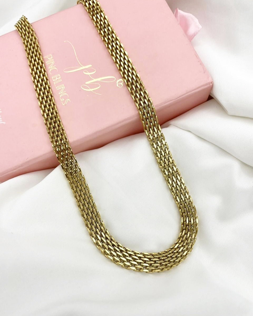 It has a sleek, layered, flat-link design that lies beautifully on the neck, giving it a luxurious yet trendy look.