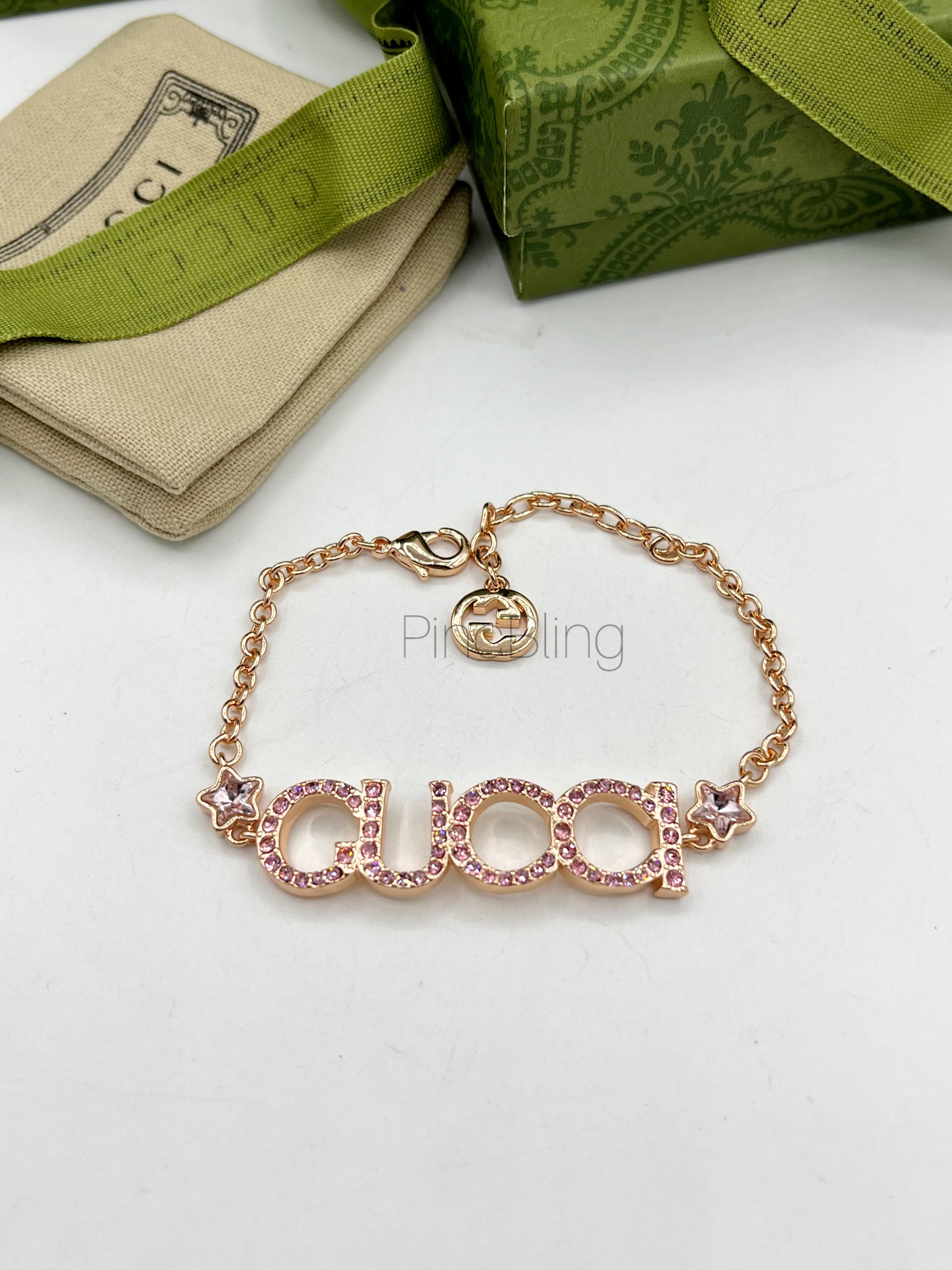 A soft rose gold branded bracelet featuring crystal embellished brand elements. Feminine, classy, and perfect for stacking or wearing solo.