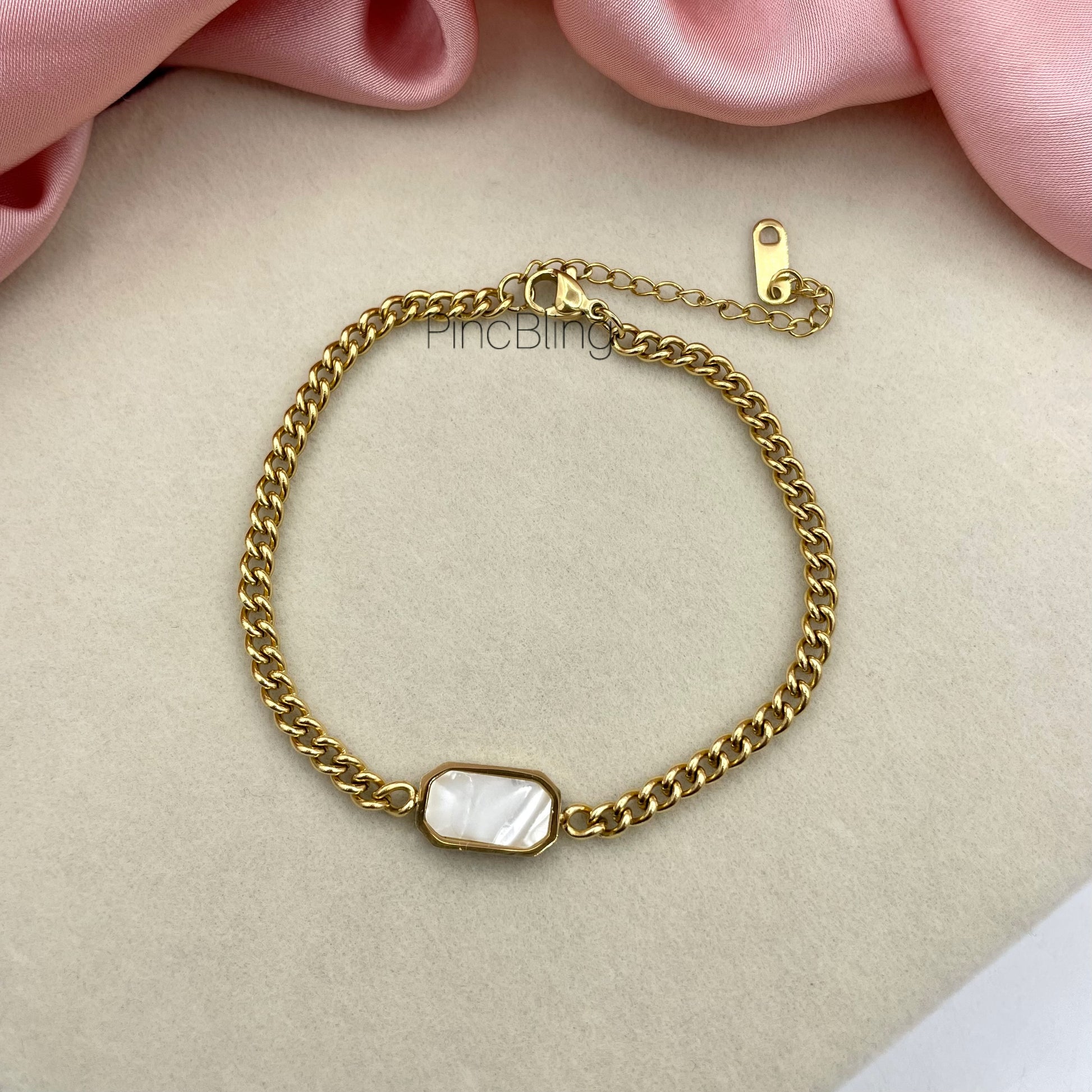 Elegant gold bracelet with a central oval pearl charm.
